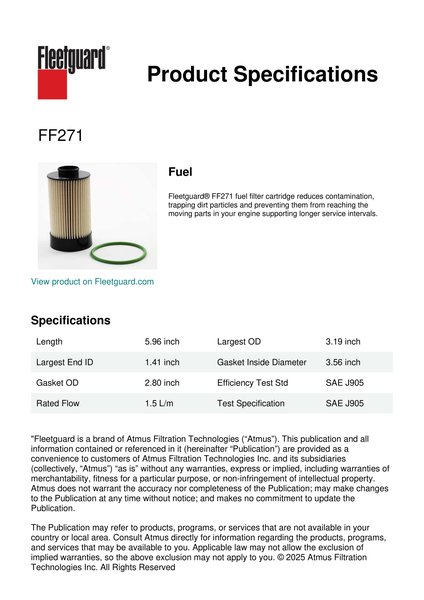 Fleetguard® FF271 fuel filter cartridge reduces contamination, trapping dirt particles and preventing them from reaching the moving parts in your engine supporting longer service intervals.Specification