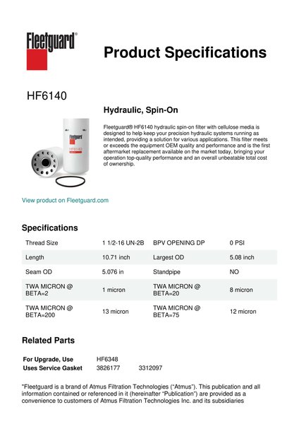 Fleetguard® HF6140 hydraulic spin-on filter with cellulose media is designed to help keep your precision hydraulic systems running as intended, providing a solution for various applications. This filter meets or exceeds the equipment OEM quality and performance and is the first aftermarket replacement available on the market today, bringing your operation top-quality performance and an overall unbeatable total cost of ownership.Specification