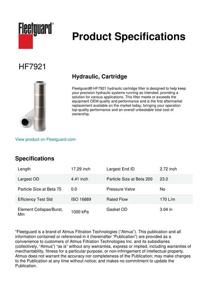 Fleetguard® HF7921 hydraulic cartridge filter is designed to help keep your precision hydraulic systems running as intended, providing a solution for various applications. This filter meets or exceeds the equipment OEM quality and performance and is the first aftermarket replacement available on the market today, bringing your operation top-quality performance and an overall unbeatable total cost of ownership.Specification