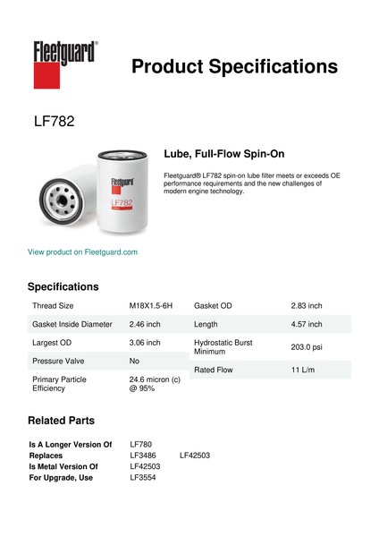Fleetguard® LF782 spin-on lube filter meets or exceeds OE performance requirements and the new challenges of modern engine technology.Specification