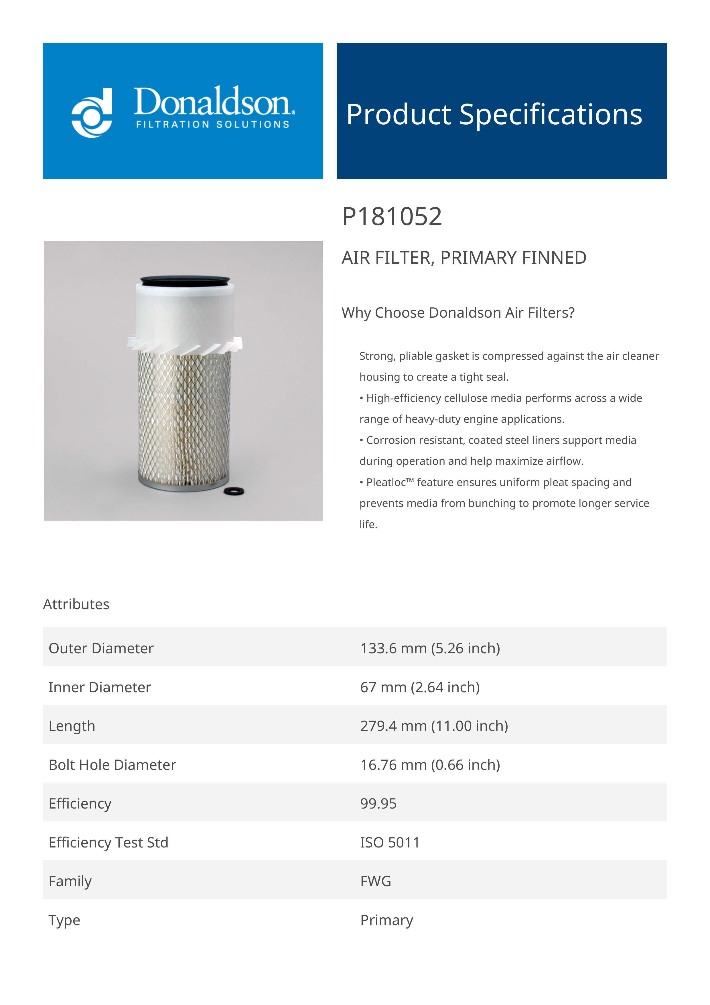 Why Choose Donaldson Air Filters?Strong, pliable gasket is compressed against the air cleaner housing to create a tight seal.