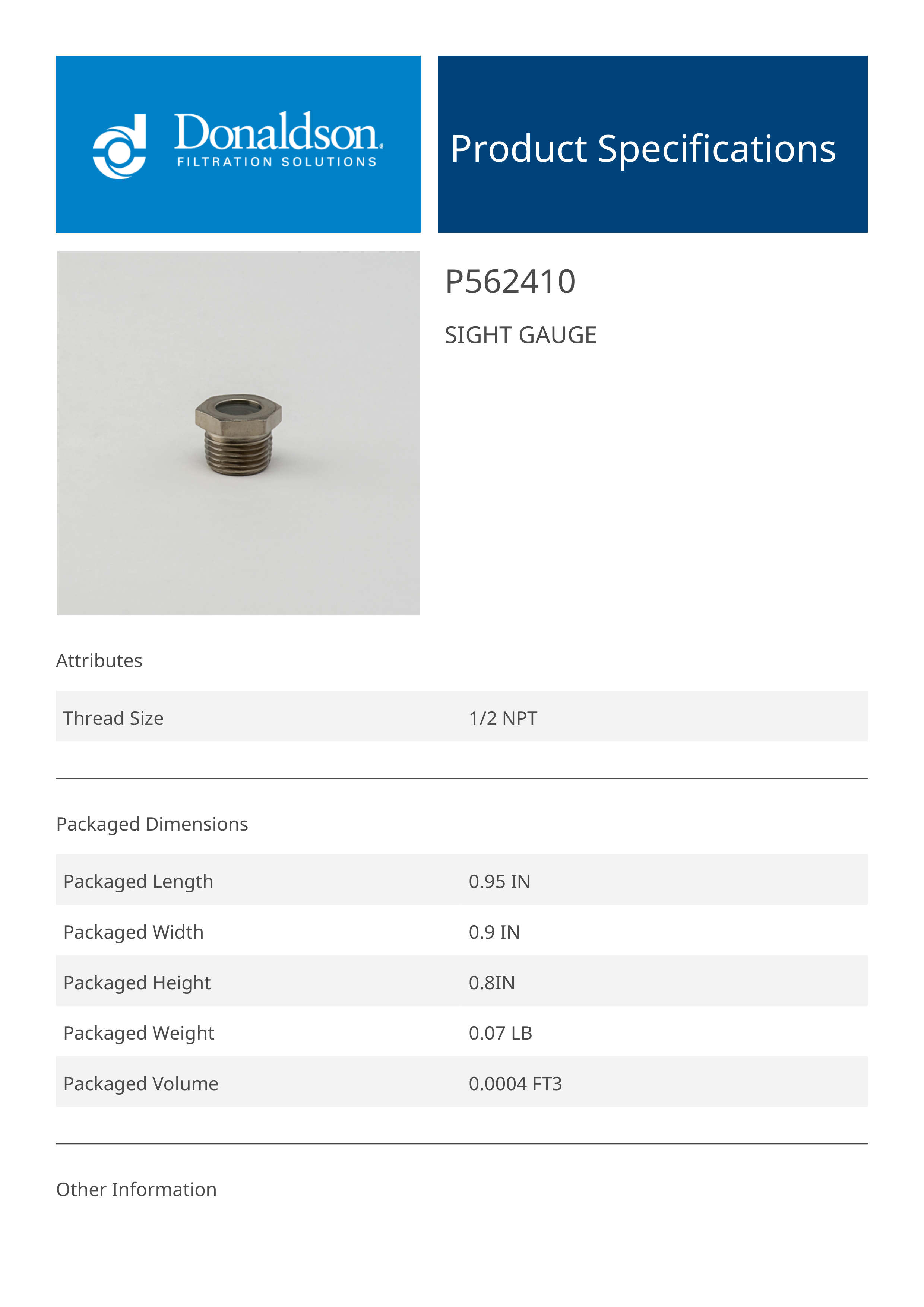 Genuine Donaldson P562410 Sight Gauge is engineered to deliver reliable performance and durability across a wide range of applications. Designed with high-quality materials, it ensures consistent functionality while meeting demanding operational requirements.Whether used in industrial, automotive, or heavy-duty settings, this component offers dependable operation and longevity. Its versatile design makes it suitable for various uses, supporting system efficiency and overall performance.