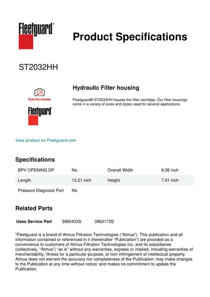 Fleetguard® ST2032HH houses the filter cartridge. Our filter housings come in a variety of sizes and styles used for several applicationsSpecification